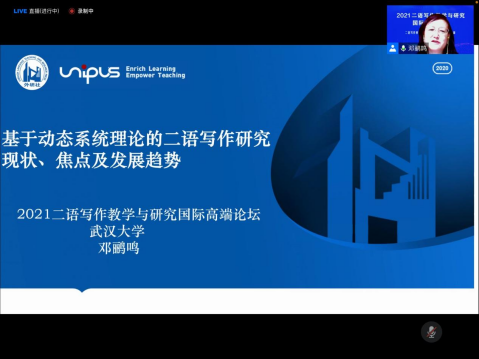 邓鹂鸣教授应山东大学特邀,于2021年8月12日作了题为“基于动态系统理论的二语写作研究现状、焦点及发展趋势”云端主旨学术报告,受到一线外语界学者、教师及硕、博学生的积极好评。此届二语写作高端论坛由山东大学外国语学院筹办、外研社协办,共有3000多名线上参与者,来自境内外11位知名二语写作研究专家应邀作了相关学术报告,论坛围绕二语写作教学与研究的理论动态方法创新议题开展多层面、多视角的深入探讨,旨在进一步促进新文科背景下我国二语写作教学与研究理论、方法创新和融合。