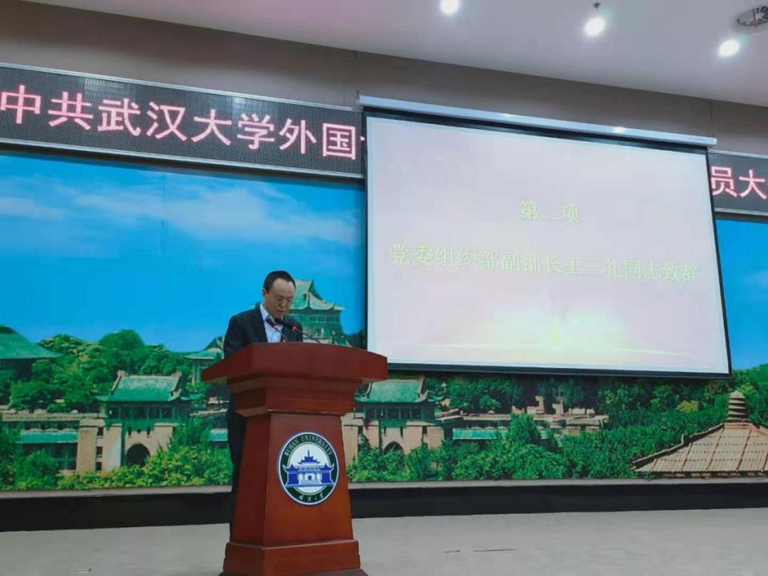 党委坚持以习近平新时代中国特色社会主义思想为指导,深入贯彻落实党中央决策部署,全面落实学校党委各项决定,锐意进取,扎实工作,不断增强学院综合实力和核心竞争力,在学科建设、人才培养、科学研究、人才队伍建设等方面都取得了较好成绩。他提到,今年是建党一百周年,也是学校“十四五”规划的开局之年,在学校大力推进“双一流”建设上水平的背景下,外语学院的发展迎来了良好的机会。他代表学校组织部提出三点期望:第一,切实加强党的政治建设,引导师生员工增强“四个意识”,坚定“四个自信”,做到“两个维护”;第二,落实基层党建工作重点任务,加大在大学生和高知识群体中发展党员工作的力度;第三,以高质量的党建引领高质量的发展,以党建促进师生成长成才。