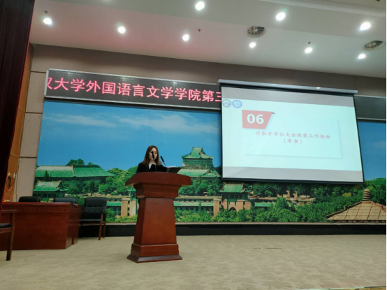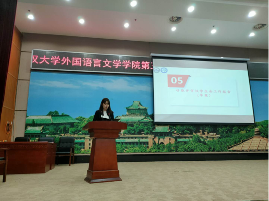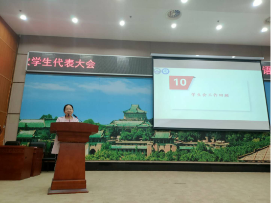 第三十届学生会主席彭博作学生会工作报告。首先,彭博同学总结了过去一年中外院学生会的工作成就:深化组织改革,狠抓内部建设,以全校第一名的优异成绩获得啪啪啦