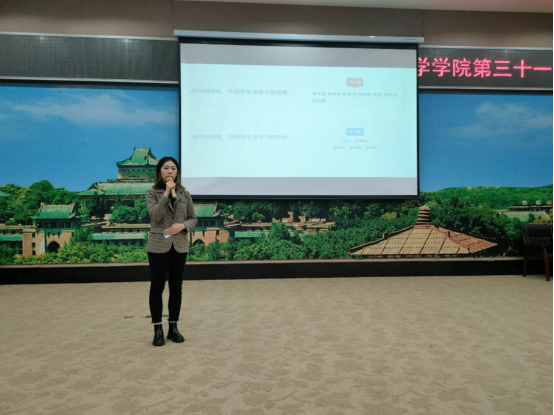“优秀骨培分校”荣誉称号;创新思政活动,加强思想引领时效,弘扬青春正能量,于线上成功举办“传播战疫故事,明确青年担当”等活动;重视学风建设,营造“崇学”“尚学”氛围;坚持志愿先行,创新青年服务形式;重视实践活动,凝聚外院力量;文艺体育并重,丰富校园文化活动,为外院学子营造了良好体育氛围;重视维权服务,倾听学生声音;立足新媒体阵地,畅通宣传渠道。随后,她对新一届学生会提出几点希望:第一,坚守工作初心,淡化功利心,少说空话,多做实事;第二,进一步建立健全学生会工作人员评价考核制度,规范学生会成员的工作态度和作风;第三,增强服务意识,牢记服务宗旨,把外院学生会建设成同学们想得起,找得到,靠得住的温暖家园;第四,开拓学生工作新思路,提升工作水平。