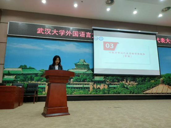 外院资格审查组组长王欣宇向大会做代表资格审查报告——193名代表均遵循公平民主的原则选出,所有代表资格有效。