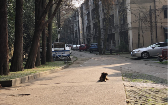 南区值守的四栋是老房子,35栋、36栋和37栋并排而立,25栋在坡上马路一侧。午间大概是休息时间,三十五栋的狗寂然地躺在地上,三十六栋飘出老歌“涛声依旧”。如果不是疫情笼罩,仿佛回到了上个世纪的岁月。