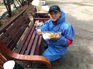 11:30左右,我已经走了大约10000步了,领取了盒饭,细看盒内内容,以前不大喜欢的土豆条、黄瓜丁、青椒鸡蛋、小白菜,特别是那只横卧在米饭中间的鸡腿:给我一种菜品丰富、味道真佳的感觉。毕竟,宅在家里这么长时间了,一个多月下来,还没有为一顿饭做过这么多道菜呢。