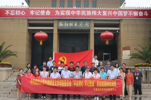 为庆祝建党98周年、中华人民共和国成立70周年,外语学院党委于2019年8月19日-21日赴西柏坡开展了“不忘初心 牢记使命”党性教育实践活动。学院党委书记黄宏发担任领队,学院院长马萧、党委副书记孙燕、副院长胡谷明、游长松参加了本次培训。同时参加培训的有学院各教师党支部书记、党员系部室主任、辅导员等共计29人。