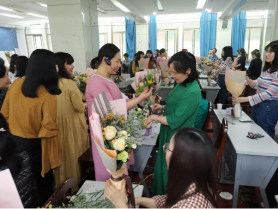 老师们捧着自己亲手制做的花束,绚烂的笑容与娇艳的鲜花交相呼应,映衬出大家如花的容颜。老师们不仅收获了插花的技巧,更在学习中回归了生活的本质,感染了艺术与生活的融合。