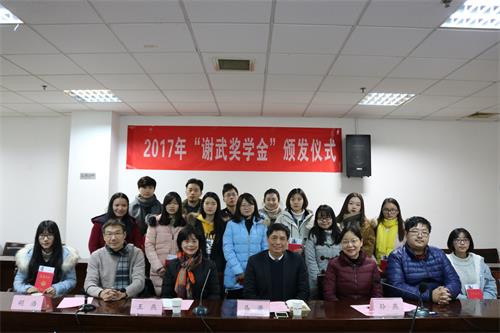 最后,由王燕女士,马萧院长,胡浩副书记和孙燕副书记为奖学金获得者颁发证书并合影留念。2017年“谢武奖学金”颁发仪式顺利落幕。2017年15名获奖同学纷纷表示将不负众望,向谢武先生学习,走好自己的人生路。