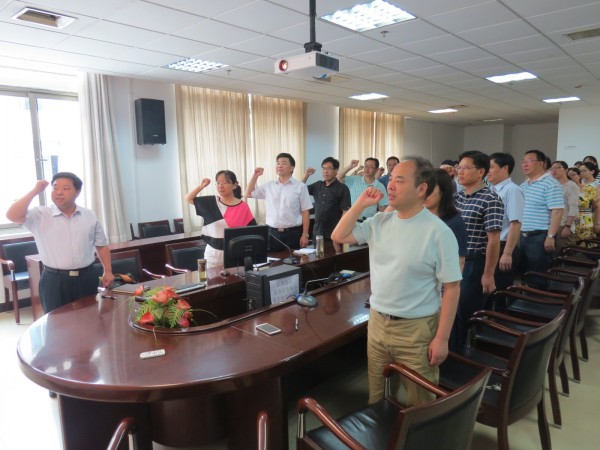 (通讯员:黄清华、江承志)为庆祝建党96周年,深入推进“两学一做”学习教育常态化制度化,6月29日,翻译系党支部、俄语系党支部和行政党支部联合开展主题党日活动-------重温入党誓词、聆听党课。院党委书记黄宏发和院长马萧以普通党员的身份参加了主题党日活动。会议由行政党支部书记周新元主持。