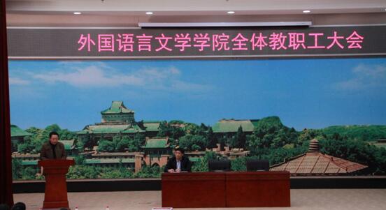全体教职工大会在外院报告厅召开,校党委组织部副部长孙太怀出席会议,学院领导班子成员及全体教职工参加会议。大会由院长马萧主持。