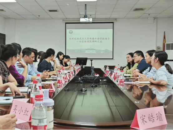 附属外语学校的特色外语教学发展历程,以及与武大外语学院传承下来的深厚情谊,结合实例阐述了“多元培养、创享幸福”的办学理念,展示了近年来外语特色教育所取得的丰硕的办学成果。随后,外校随行的各语种老师纷纷就各学科所遇到的“升学与兴趣”“教学与科研”“走出去与引进来”“口语与阅读”“国际交流”等教学困境与外院各位老师进行了深入交流。外院各语种老师从高校教研的角度出发,结合高校所特有的资源,提出“与语言国家结对子”“开展跨文化活动”“教研结合推动课题合作”“以生为本合作育人”等建议,介绍了外院各语种的教师教学资源、外语文化节等大学生品牌活动,并表示今后将加强交流、资源共享,为武大外校的发展助力。会上还就外语学院学生赴外校实习建立实习基地事宜达成合作意向。