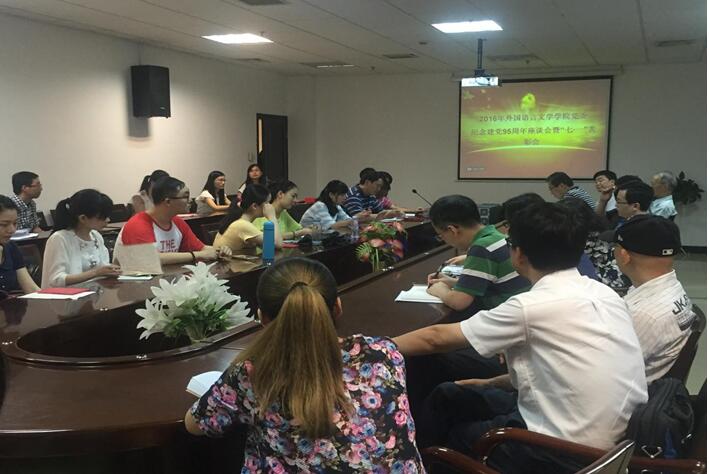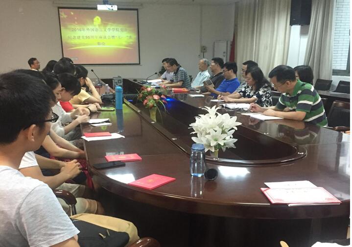 外国语言学院党委庆祝建党95周年座谈会暨“七·一”表彰会”,外国语学院党委书记黄宏发、党委副书记胡浩和学院各党支部书记以及优秀党员参加了会议,会议由胡浩书记主持。