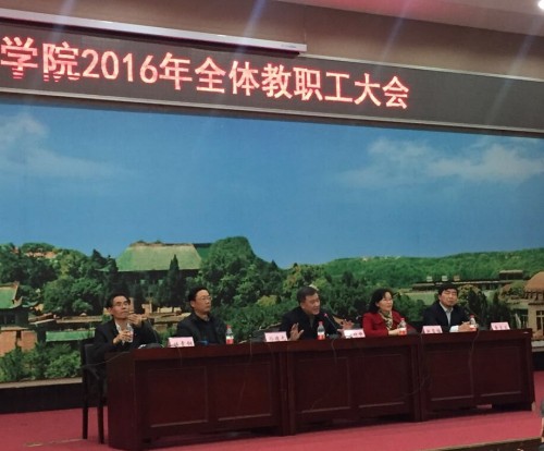 2016年全体教职工大会在学院报告厅召开。校党委常委、副校长周叶中、校党委常委、组织部部长赵雪梅、原任外语学院党委书记孙德元、新任外语学院党委书记黄宏发、院长杜青钢、学院其他党政领导班子和全体教职工参加了会议,大会由院长杜青钢主持。大会分为两个议程,一是学院新任党委书记宣布仪式;二是2015年中层领导班子述职述廉报告会。