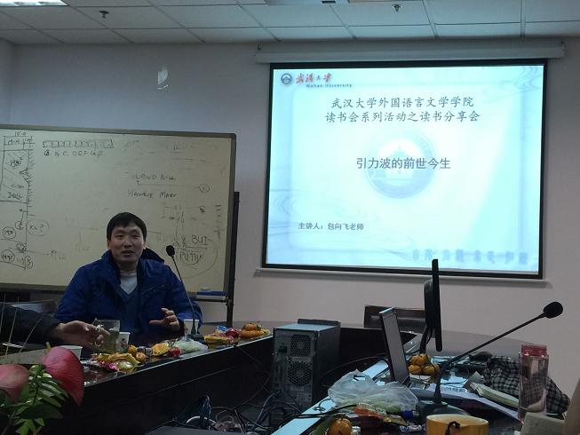 外语学院樱华读书分享会第四期在外语学院院楼3008会议室举行。这次读书会的主题为:宇宙涟漪——引力波的前世今生。主讲嘉宾有外语学院德语系主任包向飞老师,外语学院英语系主任朱宾忠老师以及外语学院党委副书记胡浩老师,吸引了来自外院、文学院等院系的近30名同学参加。