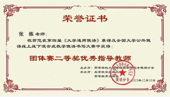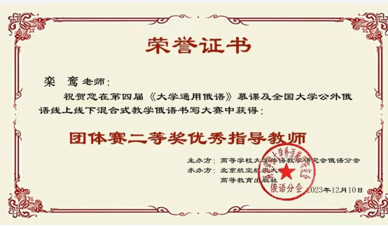 俄语系教师栾鸾、张栋荣获团体赛二等奖优秀指导教师称号。