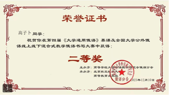 俄语系学子同样斩获佳绩,其中2022级高子卜同学获得个人赛二等奖。