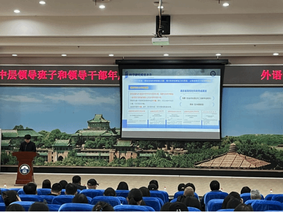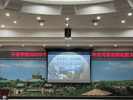 2023年度中层领导班子和领导干部考核述职述廉大会于学院一楼报告厅召开,党委书记黄宏发主持大会,全体教职工参加大会。