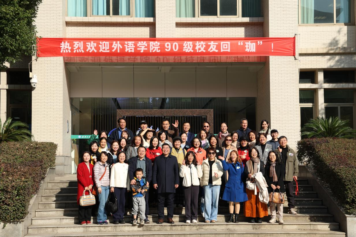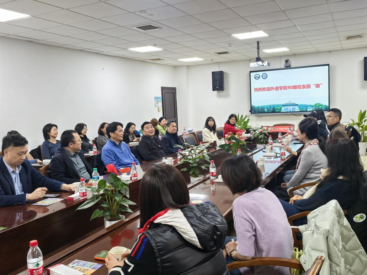 学院院长李圣杰和副书记刘涛出席了29日的欢迎晚宴,欢迎各位校友回珈。 30日,在外语学院3008会议室,校友们参加了欢迎校友回珈座谈会。外语学院党委书记黄宏发,副院长杨牧文、党政办主任王敏等老师参加座谈会。黄宏发书记发表了热情洋溢的致辞,欢迎90级校友在毕业30年以后重回母校。黄宏发书记详细介绍了外语学院的历史沿革和学科建设、人才培养等情况,对校友们情系母校表示感谢。黄书记指出,外语学院成立于1990年1月,1990级是外语学院招生的第一期学生,是名副其实的“黄埔一期”生。看到同学们在各自领域都取得非凡成就,母校老师感到非常欣慰。日语专业赵涵曦同学和英语专业周军同学作为校友代表分别发言,感激母校的培养,表示将一如既往地关注并支持外语学院的发展。同学们纷纷表示,回珈的感觉非常温暖和亲切,仿佛又回到大学时的青春时光。