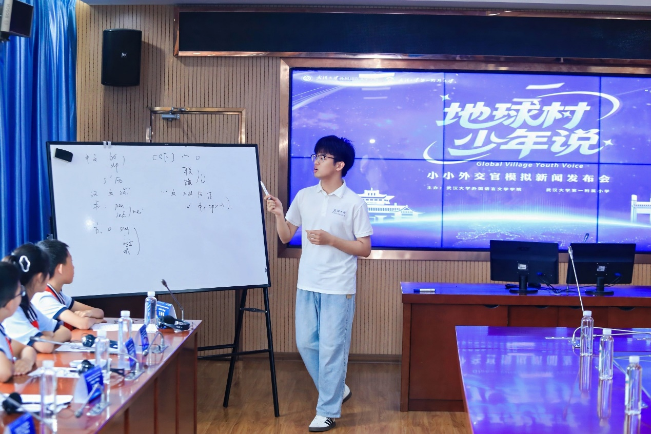 发布会正式开始后,小学生们化身“新闻发言人”,分别扮演联合国教科文组织青年文化大使、“一带一路”青少年研学项目负责人等角色,围绕中外文化交流、文化遗产保护、青少年国际合作等议题,自信地进行了陈述,分享了《数字化时代如何保护传统文化》的见解,介绍了《武汉中学生与德国学校联合环保倡议》和《中法青少年共绘“友谊之城”壁画计划》等具体行动。发言结束后,“国际媒体”记者们踊跃提问,发言人们沉着应对,展现了出色的应变能力和语言素养。活动创新设置的“新闻发言人”、“国际媒体组”和“译员”三种角色,让同学们在沉浸式体验中学习外交与媒体工作。