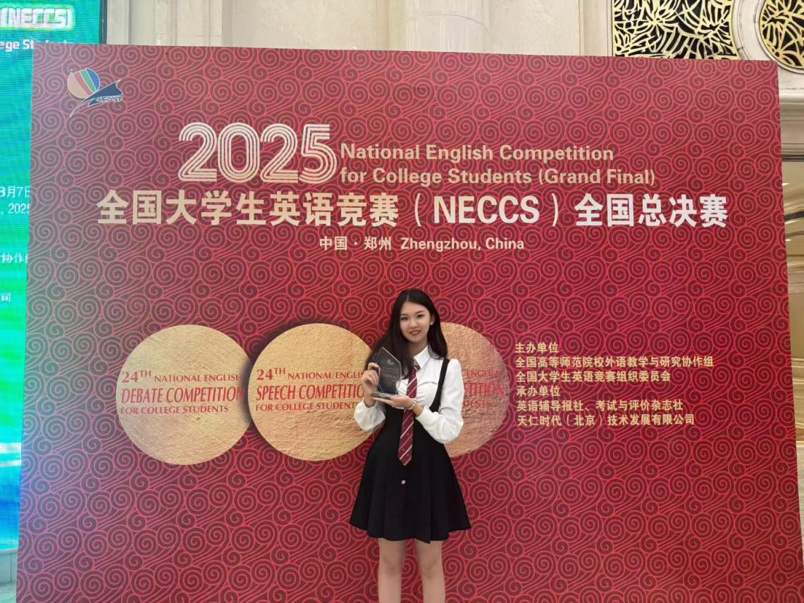 英文系2023级本科生王靖颐凭借扎实的英语专业功底、充足的知识储备和出色的临场反应,取得了全国特等奖的优异成绩。