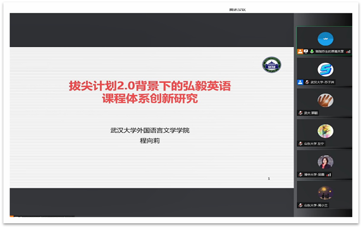 程向莉副教授做了题为“拔尖计划2.0背景下的弘毅英语课程体系创新研究”的主旨发言。程向莉副教授回顾了“拔尖计划1.0:英语语言与文化专题项目”取得的各方面成果,介绍了拔尖计划2.0背景下弘毅英语教学团队所取得的初期成果与未来举措。拔尖计划1.0时期教学团队获得湖北省高等学校教学成果一等奖。拔尖计划2.0时期,弘毅学堂英语教学团队继续深化拔尖人外语语言能力、文化素养和思辨能力的培养,着眼于教学模式、教研形式和课程体系的创新。教学理念上坚持“立德树人、博雅教育、智慧教学和产出导向”,教学上实行We Model课堂模式,并积极发展教师团队和研究生助教团队,促进“四个课堂”的建设。教研形式的创新主要表现在教研室之间的常态化“云教研”活动以及校际之间全国性的虚拟教研室活动。课程体系的创新方面,以公共外语修读方案修订为依托,推出了适应弘毅学堂学生的公共外语课程体系。人才培养方面主要体现在弘毅学生在各类全国性英语学科竞赛中获奖。