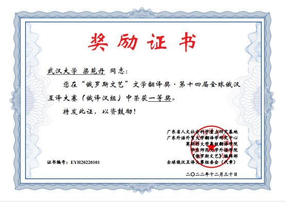 俄语系注重学生竞赛指导,在2022年度第二届“龙江杯”俄汉互译大赛中,俄语系陈睿同学、梁苑丹同学分别荣获三等奖和优秀奖,在2022年度的全国高校俄语大赛中,李秋雨获得研究生组优胜奖,高子卜同学获得低年级组优胜奖,上述各项竞赛在选拔并培养高端俄语翻译人才、发挥翻译在构建融通中外话语体系中的沟通桥梁作用方面做出了杰出贡献。俄语系梁苑丹等同学在比赛中取得优异成绩,既体现了武大外院人的实力与风采,也展现了啪啪啦