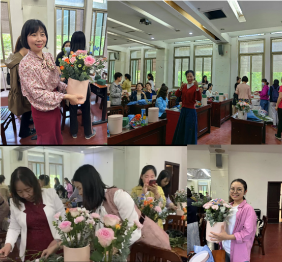 工会精致生活培训之插花活动在外语学院1033室进行,全校五十余名女教职工齐聚一堂,欢声笑语,创造精美多彩的花艺品。