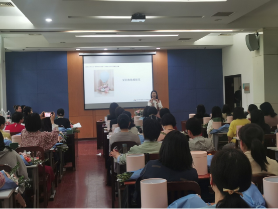 外语学院工会主席周翠芳致辞,感谢校工会对此次活动的大力支持,值此母亲节来临之际,希望此次活动能让每位老师都能身心愉悦,收获丰盈。