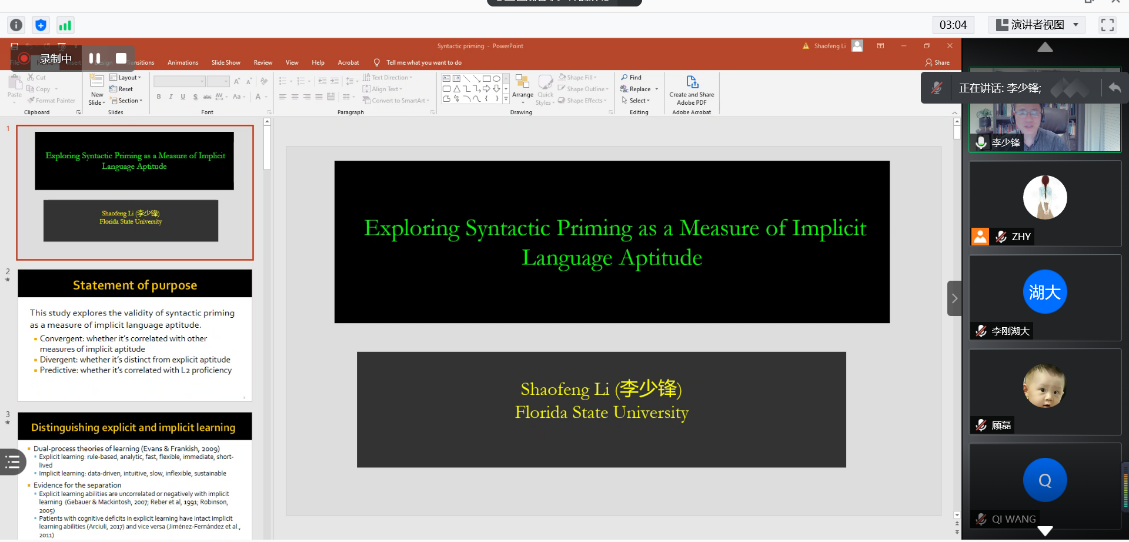 然后,李老师继续深入讲解句法前启,它是指个体在产生一个二语句子时,倾向于重复使用刚刚加工过的句法结构。李老师讲述了与前启相关的研究:前启涉及内隐学习,前启可以做为隐性语言学能的测量方式。他详细介绍了最新发表的实证研究来调查前启做为隐性学能的测量方式,他展示了研究问题(前启和其他隐性学能的测量方法的关系是什么?前启和外显学能的关系是什么?前启和二语学习成效的关系是什么?),研究方法包括其中使用的多种测试方法,讨论了研究结果,并为大家以后做此类研究提出了建议,如:确保学习者具备隐性知识,要使用多种方法测量隐性知识。