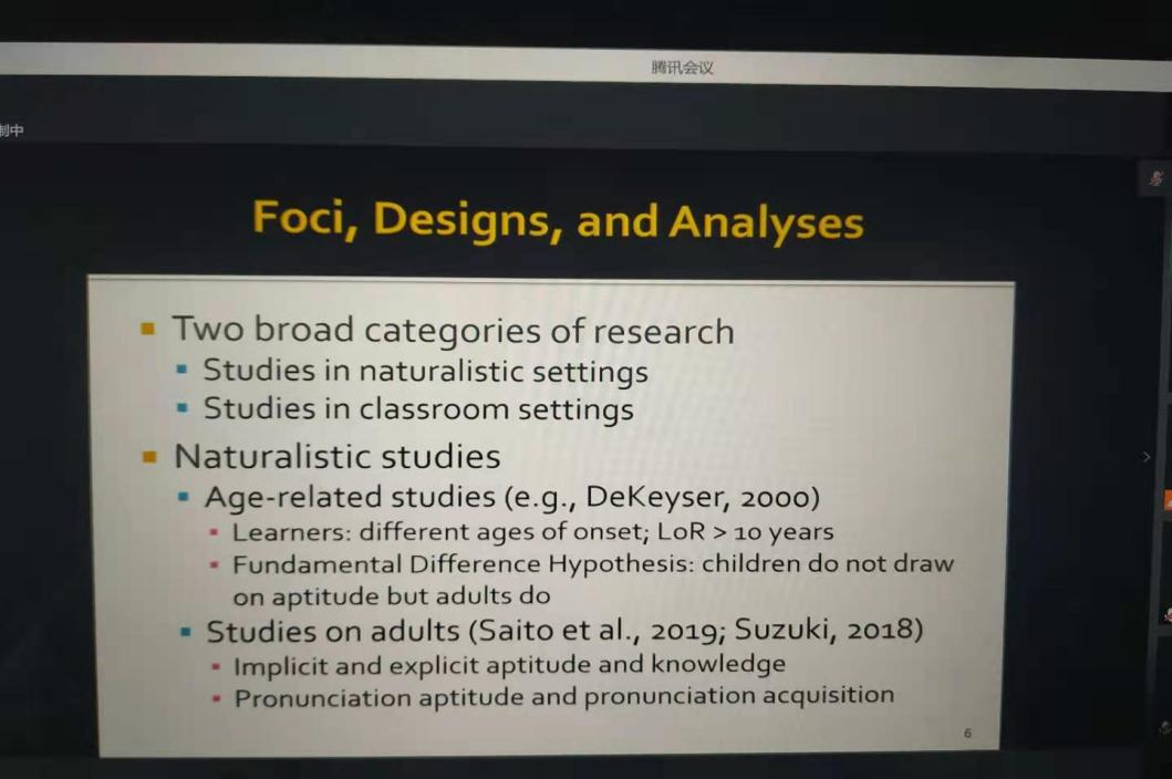 然后,李老师对学能研究方法进行详细讨论,包括研究设计,数据分析,学能以及语言水平测量方法的效度。他讲解了各类相关研究,例如:自然情境下的研究主要对学习者的起始年龄、学习成效进行分析,影响自然情境下二语习得的因素包括居住时间、学习经历以及天花板效应;而课堂情境下的研究主要包括相关性研究(如调查发音潜能和口音、可理解性即流畅性之间的相关关系)和实验研究(如测试语言学能是否与不同的教学指示有关系)。同时,李老师也指出了设计实验研究时应注意的问题和主要的教学指示,如:不要把学生划分为高学能和低学能的。随后,他分享了关于学能本质、学能测量方法以及信度和效度的相关研究。