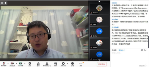 在随后一个小时的研讨中,线上师生踊跃提问互动。博士生陈菁针对学术研究领域是否应该宽泛或精专提出疑问,高老师建议学术研究起步时应聚焦某一领域,但是跨领域研究也会有帮助,所以要弄清楚研究的主要侧重点是哪个领域,进行深入研究,其他次要领域也可以做跨学科研究。博士生赵华现场连线讨论了emotion、identity、agency三者的关系,博士生章木林也对教师能动性研究进行了探讨,高教授解答了其对相关研究的困惑。接着,博士生何平提出如何看待学术研究、论文写作与个人教学生涯的关系,高老师提出研究和教学在某种程度上是有促进作用的,虽然有的研究对教学没有实质的帮助,但是可以对整个领域的发展有推动作用。硕士生王艺蓓请教硕士生的研究起步应该如何进行时间规划,高教授建议第一年要考虑定题,第二年要开始深挖研究方法和议题,也可以着手投稿,第三年要考虑自己的未来规划,完成毕业要求。还有很多师生提出了各方面的问题,热烈讨论,高教授耐心细致的解答得到了大家的频频点赞和感谢。