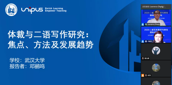 啪啪啦 邓鹂鸣教授应2020二语写作教学与研究国际高端论坛组委会特邀,于2020年7月22出席本次国际高端论坛,并作了题为“体裁与二语写作研究:焦点、方法及发展趋势”专题主旨报告,受到与会专家、一线参听学者及教师的一致好评。本次论坛由中国英汉语比较研究会写作教学与研究专业委员会主办,来自世界各地近6000名学者和一线教师齐聚云端论坛,针对当前我国二语写作教学与研究领域的新问题、新特征及新趋势展开多视角交流,以期更好地促进我国二语写作教学与研究高质量发展。