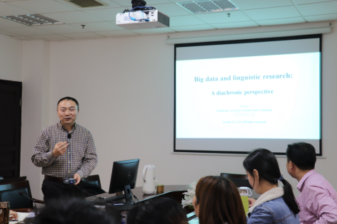 2019年10月24日下午两点,“大数据时代的语言研究:历时视角”(Big Data and Linguistic Research: a Diachronic Perspective)专题讲座在外语学院3008会议室成功举行,讲座由外国语言所所长英文系邓鹂鸣教授主持,英文系张妍岩、李丹丽、刘庆荣、李映老师、大英部程向莉、桂敏等老师以及我校其他系多名教师和硕博研究生参加了讲座。