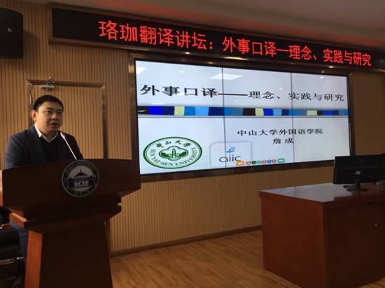 ,在4016同传室做了题为“外事口译——理念、实践与研究”的讲座。詹成教授系世界口译最高行业组织——国际会议口译员协会(AIIC)在华南地区的唯一会员,也是国际译联(FIT)和国家人社部认证的同声传译员,具有18年国际会议口译工作经验,为千余场次国际会议提供同声传译,先后为多位中外政要担任过译员,曾因圆满完成奥运会和残奥会的翻译工作被授予“中国翻译事业优秀贡献奖”。詹成教授还出版了四部专著,在Interpreting、《中国翻译》、《外语界》等国内外学术期刊上发表近四十篇论文,编写了十部国家级规划教程。