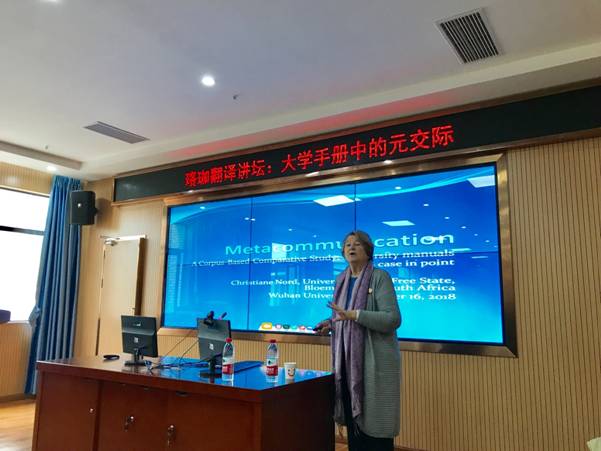 翻译系主任熊伟教授主持了讲座。在简短介绍之后,诺德教授围绕元交际(metacommunication)的定义、分析元交际功用的语料库的建库标准、元交际的指称功能三个话题展开了讲座。