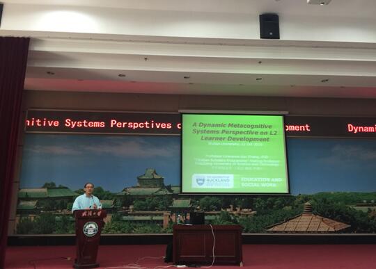 张军教授在整场讲座中对元认知及元认知动态系统论进行了详细的介绍与解说。讲座内容分为两大部分。第一部分是对元认知的概述。张军教授以“为什么谈论元认知以及元认知包括什么”这个问题,引出了讲座主题。他首先指出心理学在教育研究及改革中的重要性逐渐显现出来。作为心理学研究热点之一的元认知,对于二语习得研究有着深刻的影响和积极的作用。随后,张军教授又列举了知名专家学者对于元认知的定义,指出元认知包括元认知知识和自我调节。最后,张军教授指出元认知在外语教学研究中的重视程度在不断加深。