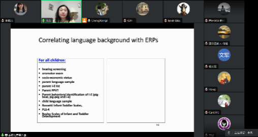 老师和学生作线上讲座,讲座主题为“具有不同语言背景的婴儿、儿童和个体听觉加工的神经指标”(Neural indices of auditory processing in infants, children and individuals with diverse language backgrounds)。本场讲座由外啪啪啦