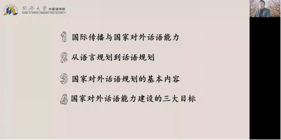 通讯员:钱静华 2022年4月1日上午,同济大学外国语学院副院长沈骑教授应邀为外语学院师生开展线上讲座,主题是“国际传播视阈下的国家对外话语能力建设”。该讲座由英文系李丹丽老师主持,外语学院程向莉副院长、张妍岩副院长、张国庆教授、邓鹂鸣教授、熊伟教授,以及文学院赫琳教授等多名教师和研究生在线下与线上同步观看讲座,线上吸引了来自国内多所高校的500名听众参与交流。