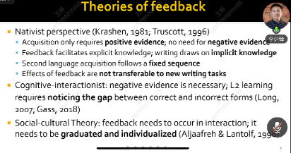 讲座伊始,李少峰教授以其深厚的理论功底和前瞻性的研究视野,系统梳理了反馈理论基础与分类体系。他从强调内在语言习得机制的天赋论(nativist perspective)、重视纠错与互动作用的认知-交互论(cognitive-interactionist perspective),以及主张在最近发展区内提供支持的社会文化理论(social-cultural theory)等视角,阐释了反馈在外语学习中的重要作用。在此基础上,李教授进一步从目标、范围、性质与形式、提供方式等多个维度对反馈类型进行细致划分,并指出当前研究在反馈内容层面仍存在不足,为后续探讨奠定了清晰的理论框架。