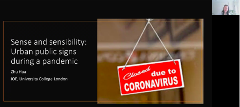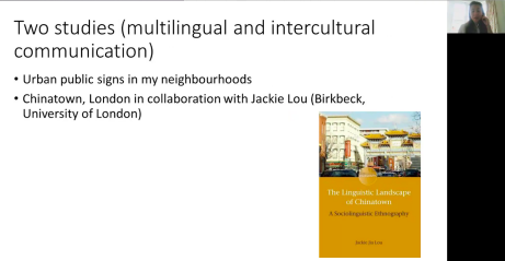 赵世举教授和赫琳教授的学术合作成果——《“战役语言服务团”的实践与思考》,赞扬了新冠疫情暴发后,中国语言学人自发组建"战疫语言服务团",为抗疫行动提供了切实的应急语言服务。然后,祝华老师以自己在疫情期间的城市公示语研究为例,展现了伦敦街头和中国城一些商家的公示语数据。她的研究发现商家在不同时期的公示语表明了与新旧顾客的不同关系,揭示了多语公示语的符号学和话语策略等。祝华教授的研究告诉了我们解决有效沟通也可以成为社区建设的途径,通过语言建立联系可以修复社会裂痕。