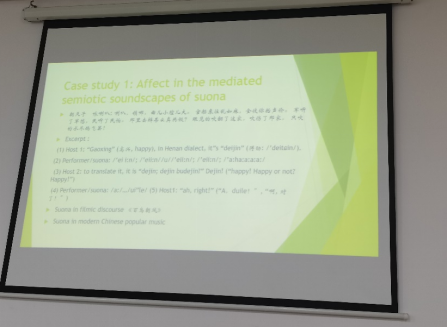 讲座伊始,王佳宇老师在第一部分对传统社会语言学领域的语言研究进行了梳理。他首先讲述了社会语言学中语言的口头和书面形式(spoken and written form),回顾了索绪尔和乔姆斯基等的语言学观点,探讨了语言学是社会导向还是语言导向的问题,指出当前研究逐渐不再把语言看成一个独立的系统,身份与语言的关系是固定性和流动性(fixity and fluidity)。在讲座的第二部分,王老师关注了社会语言学中的语言观演变,主要分为两类:一种是语言是多模态建构中的一部分,另一种是语言作为多模态建构的接口。在第三部分,王老师指出我们要跳脱西方的传统艺术人文主义理念,逐渐思考后人文主义语言观和社会语言学的本土化路径,特别是在中国的语境下,我们能够做些什么研究。他追溯了后人文主义的起源,讲解了后人文主义理论的应用,并将中国唢呐作为多模态语言景观进行案例分析。最后,王老师概述了社会语言学视角下语言观的新发展,即将语言视作一种多模态符号或将语言本身视为多模态。他阐述了两种语言观的分类,考察了国内外社会语言学领域出现的关于语言研究的新概念和新方法,旨在探讨语言的本体论问题,语言在多模态实践中的地位、研究路径以及社会语言学最新发展及在中国语境下的本土化等问题。