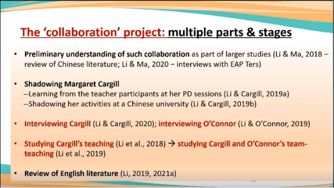 讲座的第二部分,李詠燕老师通过介绍自己的两项实证研究,从前期文献准备,研究问题,研究方法,数据收集,数据分析,研究结果撰写这六个方面细致地展示了跨学科合作教学研究的设计思路和研究流程。接着,李老师真诚地给老师们的研究选题提供了思路引导。 此外,李老师还强调,老师们应从自身出发,采用自下而上的方法,主动地联系专业教师寻求合作。最后,李老师鼓励老师们阅读该领域的书籍和期刊文章,并推荐了该领域的四个期刊:The ESP journal, Journal of English for Academic Purposes, Journal of English for Research Publication Purposes,和International Journal of English for Academic Purposes。