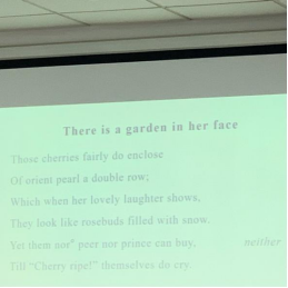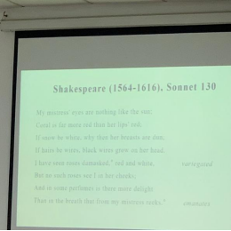 讲座伊始,郝田虎教授亲切地分享了自己在北大求学时的经历,教导同学们在读书期间要潜心学习、刻苦钻研。在进一步讲解英国文学研究的过程中,郝教授以英国文学史上极为经典的两位作家——莎士比亚和弥尔顿为例,指出就文学研究而言,研究对象的选择是至关重要的。同时,郝教授提到,随着网络上的学术资源不断丰富、多元化,发掘、搜集和运用各类数据库等新材料和新方法更是文学研究者应掌握的技能。随后,郝教授以托马斯·坎皮恩与莎士比亚的诗歌(“There is a garden in her face,” “Sonnet 130”)为例进行对比分析,分享了如何运用细读这一文学批评的重要手段阐释文本:两首诗歌虽均是描写女子外貌,但坎皮恩的诗中仅运用了常规的修辞,对常见意象进行描述,而莎士比亚却解构了陈腐的比喻,反其意而用之,并与文学传统进行对话。最后,郝教授解释了熟悉文学史的重要性,说明文学研究者要对经典作品有所了解,以便在此基础上对后续作品展开分析。