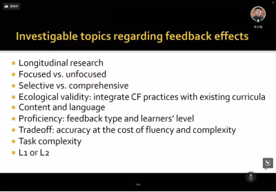 在教师反馈研究中,李少峰教授以Lee(2004)和Ferris(2014)等学者的研究举例,突出了观察研究和自我报告研究方法在此类研究中的运用。此外,李老师还讨论了个体差异对反馈的影响、同伴反馈、针对内容和语言的反馈、现有研究的方法论特征等。在现有研究基础上,李少峰教授指出了未来反馈实践、反馈效应、反馈信念研究的其他可行性主题,比如纵向研究、生态效度、任务复杂度、动机、认知和情感等。最后,李老师总结了纠正性反馈在实际教学中的运用,给二语及外语教学领域的研究者、教师和学生都带来了极大的启发。