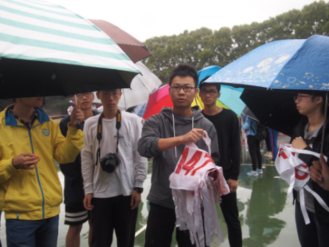 尽管从清晨起便一直飘着雨,外院体育部人员还提前在外院大厅集合,商讨着比赛事宜,外院体育部的沈明明同学也是其中一员,她说道:“到了奥场发现所有的运动员和工作人员都是积极地去面对坏天气,我当时还和说运动员们在这种天气跑步淋雨出汗很容易感冒的,但他们说没关系,接力赛一个人也只跑几分钟,我心里感觉特别暖,特别感谢大家能够积极地配合。”