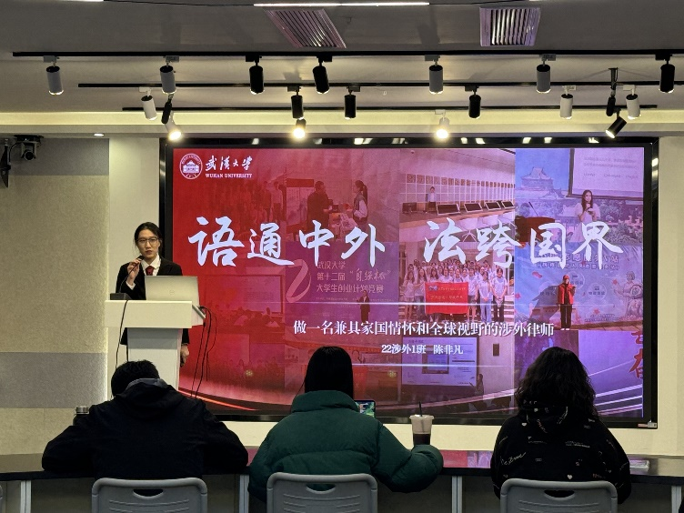 心怀祖国、放眼世界。陈非凡同学关注国内外局势,与时代同频共振,洞察经济全球化背景下我国在国际贸易中面临的风险与挑战。同时,她通过相关数据了解到我国涉外法律人才存在巨大缺口,积极响应国家加强涉外法治建设的号召,立志成为一名兼具家国情怀与全球视野的涉外律师。综合多方信息,她分析了涉外法律人才所需的能力素养和自身的核心专业能力,并以优秀的学校平台和自身丰富的行动成果证明了职业目标的可行性。最后,在未来规划中,她针对自己的不足给出了相应的改进措施并制定了未来三年的行动计划。在整场路演中,她充分表达了自己“语通中外,法跨国界”的职业期待。