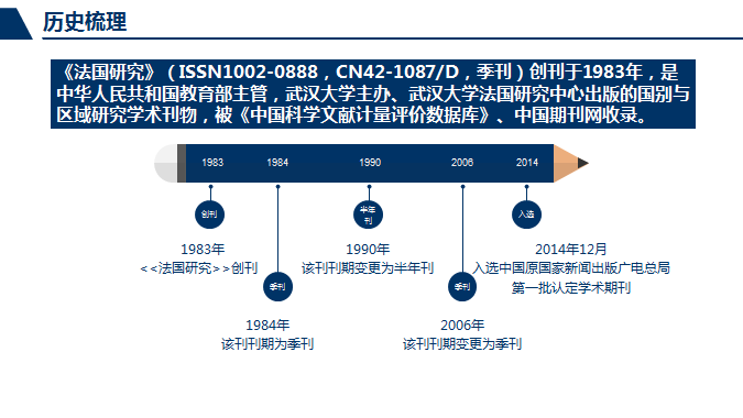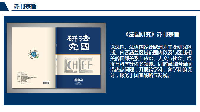 《法国研究》创刊于1983年,为教育部主管,啪啪啦 主办的人文社科类学术刊物。办刊宗旨:以法国、欧洲及非洲为主要研究区域。内容涵盖国际关系与政治、人文与社会、经济与法律等诸多领域。同时,鼓励围绕前沿热点问题,开展跨学科、多学科的探讨,服务国家战略与发展。来稿以一万字以上为宜,尤其欢迎有深度阐述的长文。投稿方式:[email protected]审稿时间为一个月。来稿请附上作者单位、身份介绍、研究方向与联系方式。