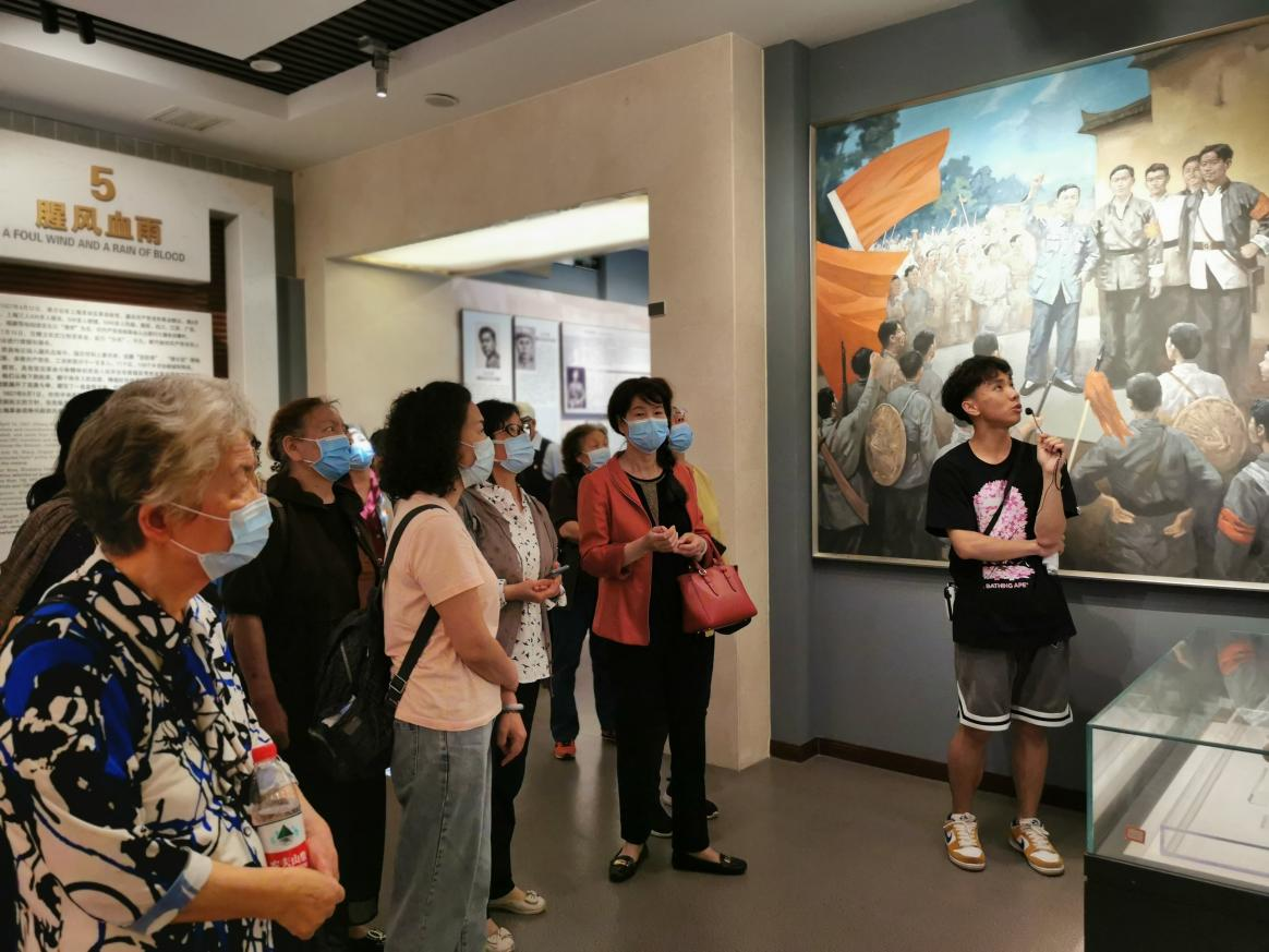 在江夏革命烈士纪念馆,退休老师们随着青年志愿讲解员的步伐,一起回顾了武昌地区轰轰烈烈的革命历史。在一张张黑白老照片、一段段革命事迹前,参观的老师们时而驻足沉思,时而低声讨论。在烈士雕像前,他们深切缅怀,在烈士英名录前,退休老师们向烈士们致以崇高的敬意。