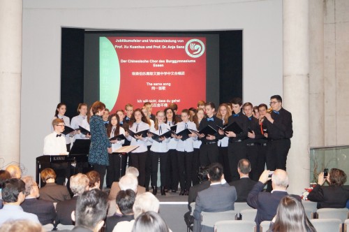 孔子学院的合作单位——埃森伯乐高级文理中学中文合唱团的学生们在庆典进行过程中演绎了六首中、德文歌曲,为庆典活动平添了一缕青春的亮色。庆典活动由新任主管乐苏珊女士主持。(鲁尔都市孔子学院)