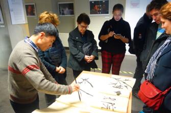 在巴黎七大行政楼一楼的前厅,孔院书法班的老师铺纸砚墨,为学生们做了精彩的中国书法、中国绘画表演。其间许多法国学员跃跃欲试,纷纷拿起毛笔、画笔向老师求教指导。孔子学院书法班的部分学员与老师们进行了同台表演。