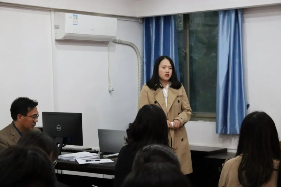 翻译系20级研究生陈竹园作为口译队队长发言。她表示口译队队长应发挥老师与队员之间的纽带作用,这既是一份荣誉,更是一份责任。她倡议口译队队员:磨练专业技能,提升综合素质,勇于担当使命,尽最大努力发扬、壮大口译队。